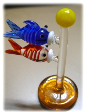 その脇にちょこんとおかれていたこのこいのぼりを見つけて買って帰った。とってもかわいいでしょう?高さ7?のこのガラスの棒に2つのこいのぼりがついています。